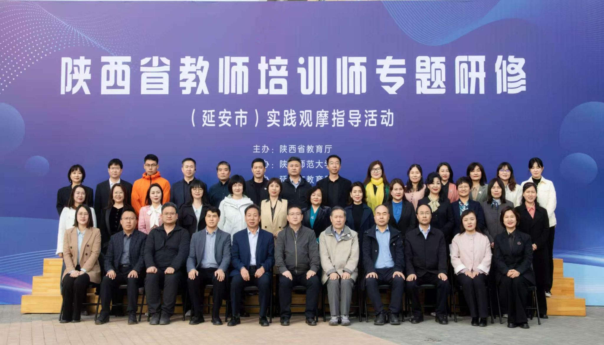 、延安市教研室相关领导参加了开班仪式,陕西省教师培训师专题研修项目学员及延安市各县区教育工作者3600余人在主会场和分会场现场参与了实践观摩指导活动。
