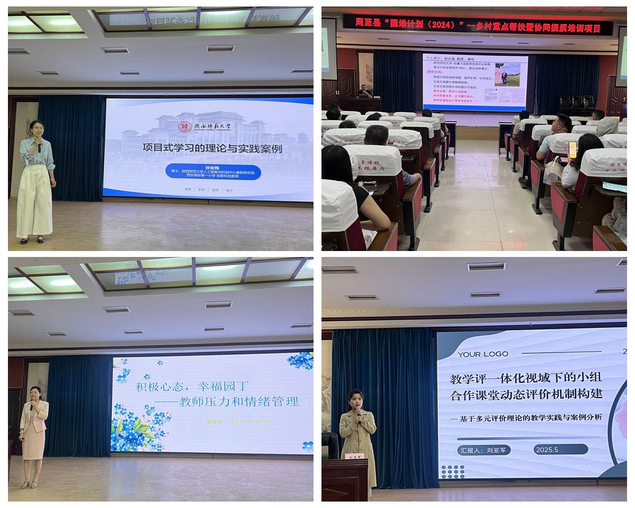 郝长春教授、渭南初级中学刘亚军老师、西安高新第一小学孙俊梅老师和西北工业大学附属中学喻永婷老师,分别从论文课题选择和撰写方法、教学评一体化、项目式学习和教师情绪管理等方面进行了专题讲座。